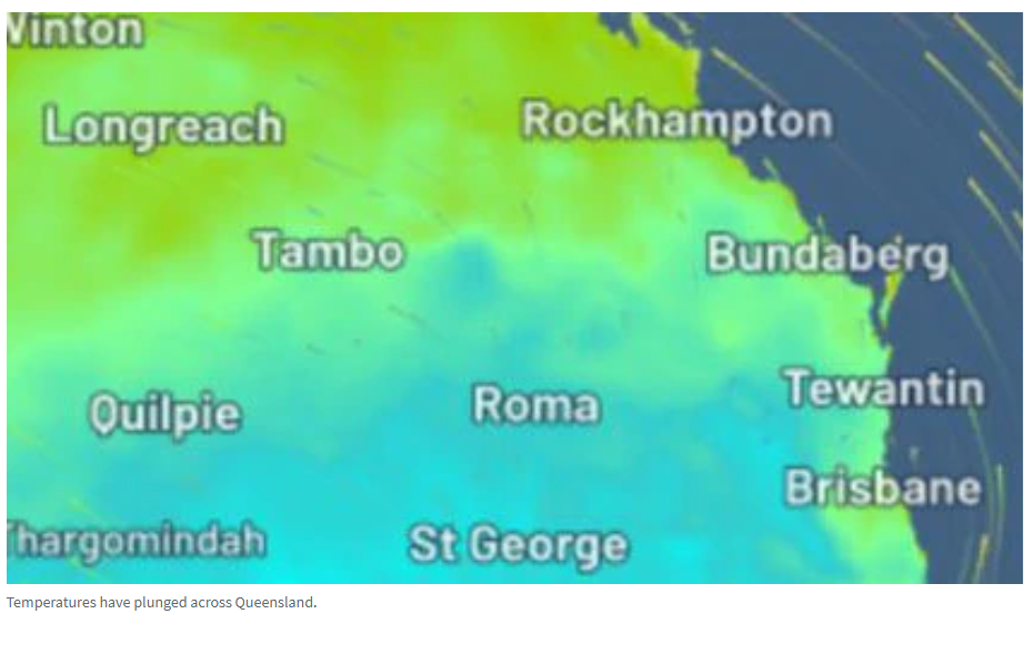 气象局数据显示,昆州南部地区气温降至个位数,其中Chinchilla在早上6点刚过时气温为1.9℃,但体感温度为-1.1℃。