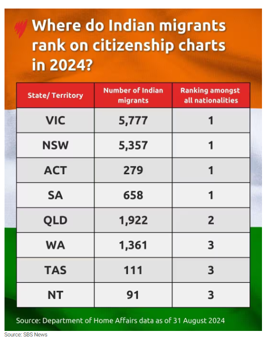 截至8月31日,在2024年通过授予获得公民身份方面,印度移民在澳大利亚八个州和地区中的四个州排名第一。
