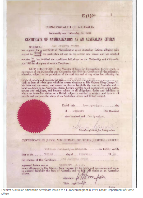 第一位成为澳大利亚公民的"非英国臣民"是Jandura [Jan] Pucek,他于1939年从捷克斯洛伐克移民到澳大利亚。