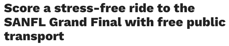 据悉,为了缓解比赛日的交通拥堵,阿德莱德地铁公司将在本周日为前往Adelaide Oval观看Hostplus SANFL总决赛的所有球迷提供免费公共交通服务。持有总决赛门票的球迷可以免费乘坐阿德莱德地铁公司提供的所有巴士、有轨电车和火车。
