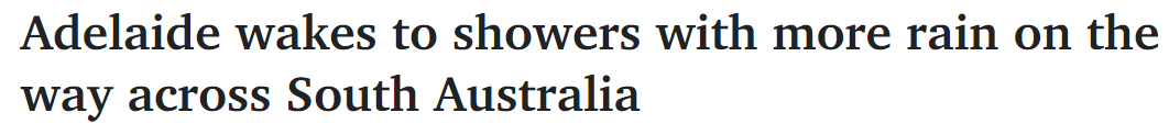 在市区,降雨主要集中在南部,Noarlunga录得4.2毫米,而Mount Lofty录得3.2毫米。市区录得0.8毫米。