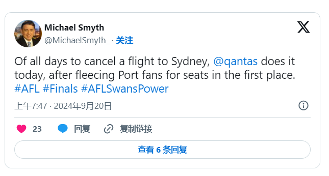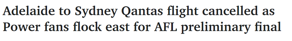 今天早上,在Port Adelaide队与Swans队在SGC的决赛前,从阿德莱德飞往悉尼的澳航航班被取消。