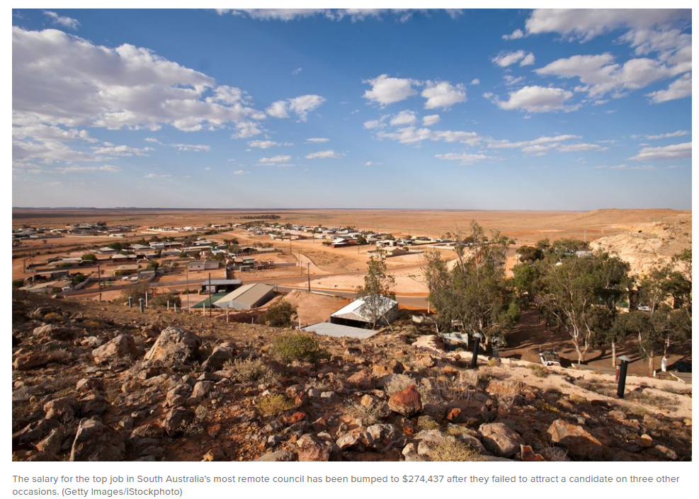 据悉,南澳的内陆小镇Coober Pedy为寻找一位合格的行政管理者,将薪酬待遇额外提高了4万澳元,达到27.4万澳元。这已经是该地区第四次发起招聘。