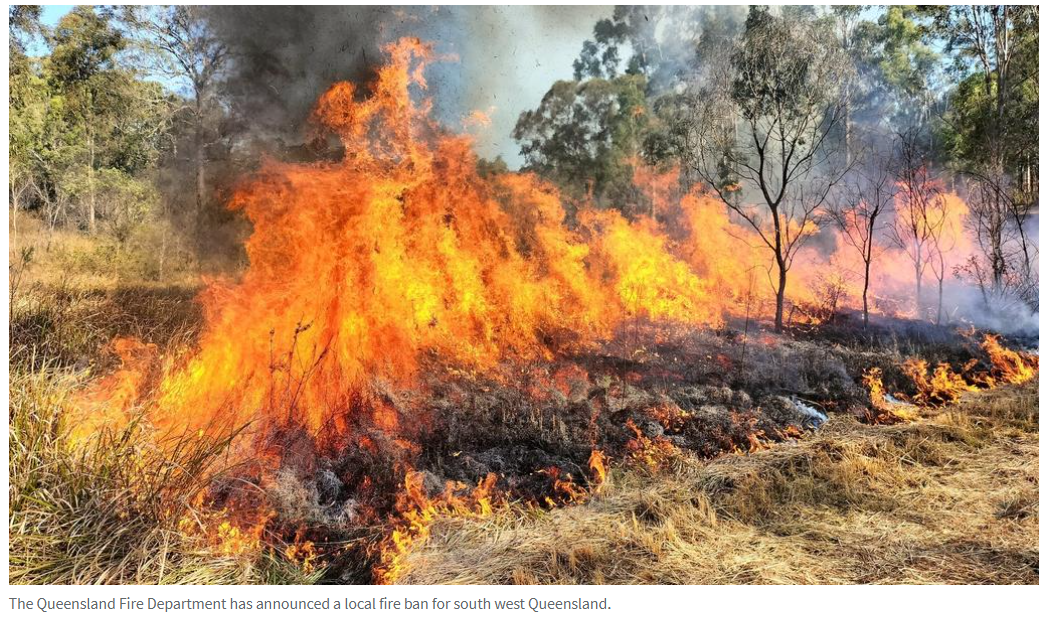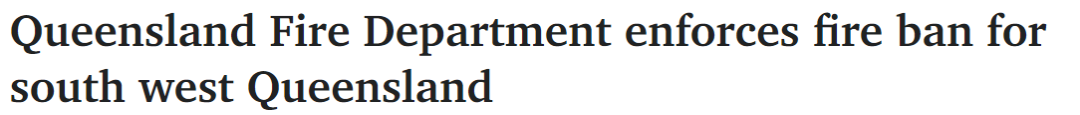 周日,昆州消防局表示,将对昆州西南部多个地方政府辖区的居民实施禁火令。禁令将于周一生效,适用于Toowoomba, Southern Downs, Western Downs, Goondiwindi, Maranoa, Balonne, Murweh, Paroo, Quilpie和Bulloo地方政府辖区的居民。