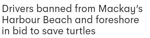 但Mackay地区委员会投票决定禁止车辆通行,因为市长Greg Williamson认为此举"严重破坏了前滩,影响了沿海动植物以及海龟和海岸鸟类筑巢地"。