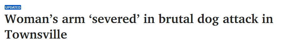 据悉,Townsville一名30多岁的妇女在一场袭击中被狗咬断了手臂,随后被紧急送往医院。
