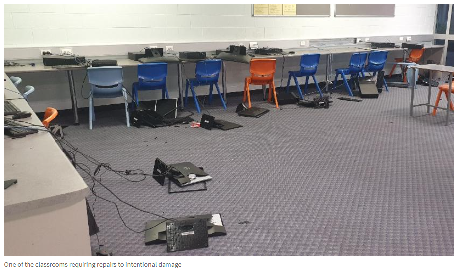 《The Courier-Mail》获得的140多张照片显示了部分学校受损的程度,包括地板被撕裂、电脑被砸碎、教室被油漆溅满、厕所被烧毁以及窗户、玩具和书架被破坏。
