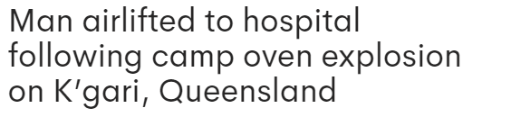 周三晚上,这名20多岁的男子当时正在K’gari(前身为Fraser Island)Orchid Beach的一处房产内。8点21分左右,一台据信是野营炉的设备发生爆炸。