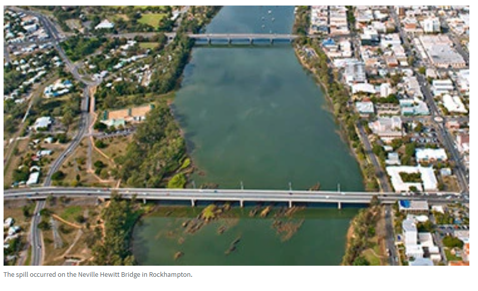 在Rockhampton的Neville Hewitt Bridge上,发生危化品泄露事件,危险品处理人员和科学专家正在紧急处理。