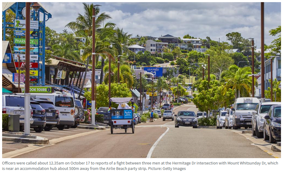 10月17日凌晨12点35分左右,警方接到报警,称三名男子在Hermitage Dr和Mount Whitsunday Dr的交叉路口发生斗殴,该路口靠近一个住宿中心,距离Airlie Beach派对区约500米。
