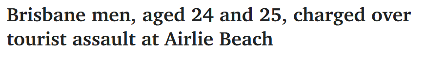 据悉,两名来自布里斯班的男子因在Airlie Beach袭击游客而被起诉,冲突导致一名年轻游客可能下颚骨折。