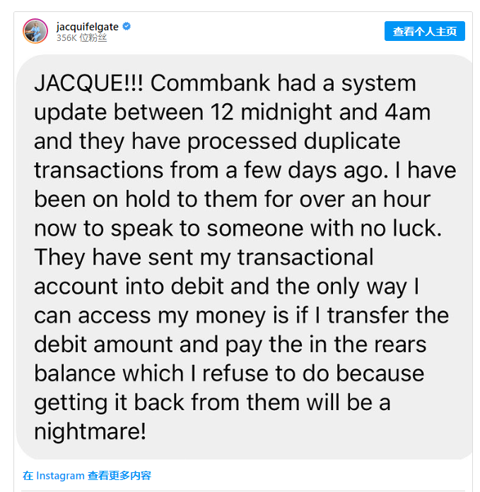 电视节目主持人Jacqui Falgate在Instagram上表示,她被银行晾在那里了一个多小时。