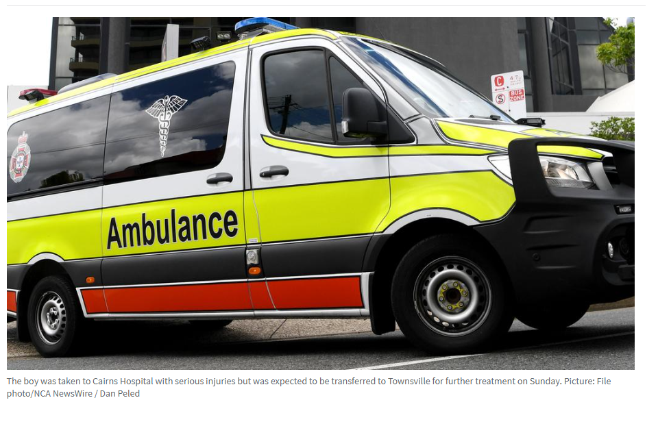 男孩因伤势严重被送往Cairns Hospital,预计将于周日转送Townsville Hospital接受进一步治疗。