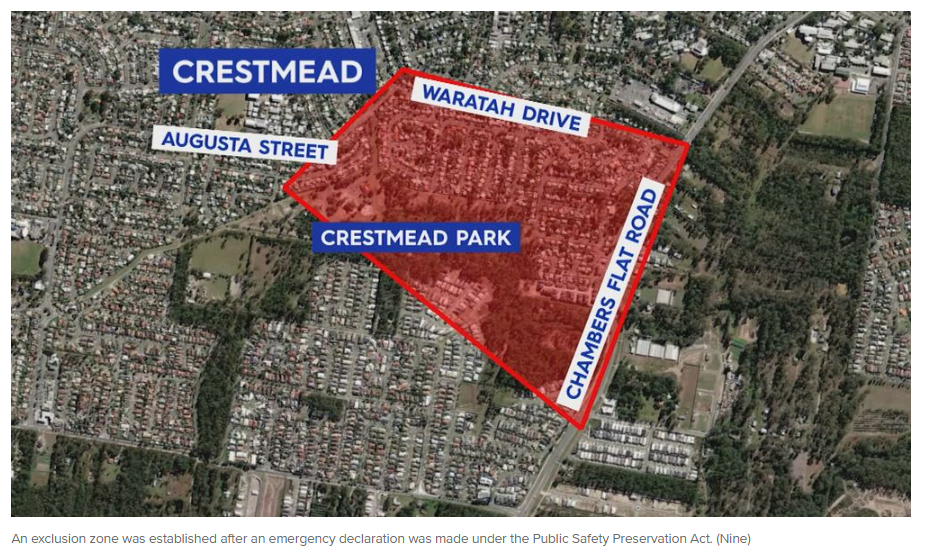 根据《公共安全保护法》发布紧急声明后,从Waratah Drive到Augusta Street和Chambers Flat Road的区域被划为隔离区。
