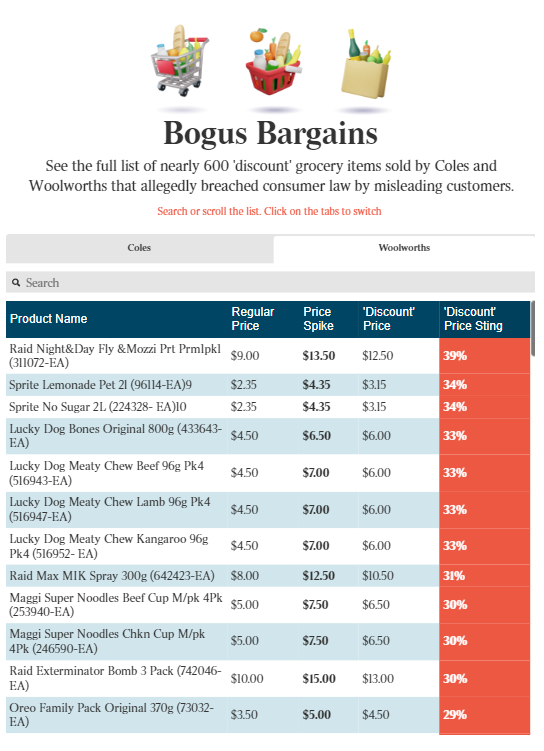 根据ACCC向法院提交的文件,Raid night & day mozzi spray是Woolworths虚假折扣中的佼佼者,其折扣价实际上比正常价格高出39%。Lucky Dog宠物食品也有类似的虚假折扣,实际上比正常销售价格高出33%,而可口可乐的折扣则比正常价格高出28%。其他商品,如奥利奥饼干,比实际成本高出29%,监管机构详细描述了每家超市零售商抬高货架价格,然后小幅降价,以诱使顾客以为获得了真正折扣的过程。