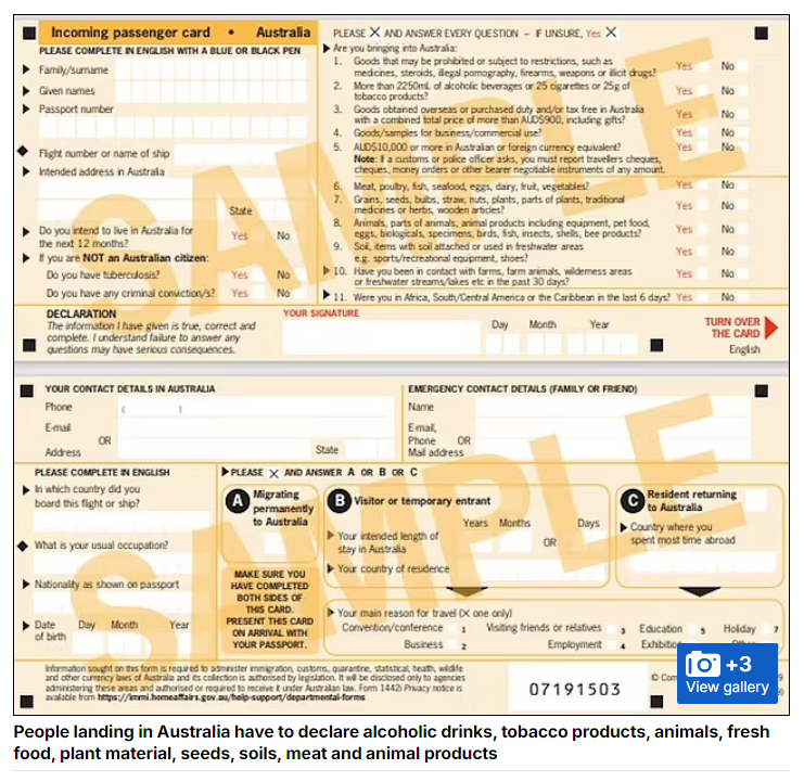 通常在飞往澳大利亚的航班上会发放纸质卡片,但旅客也可以在抵达前72小时完成电子申报。