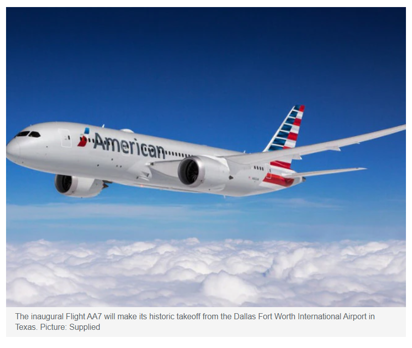 首航AA7号航班于当地时间晚上10点从Dallas Fort Worth International Airport起飞,最终降落在布里斯班机场,这是美国航空最长的跨距飞行,跨越13000多公里。