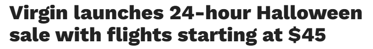 标题: 维珍航空推出24小时万圣节促销,机票低至$45起!