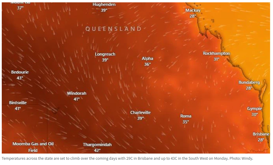 预测图显示,Birdsville和Bedourie等海峡乡村城镇的气温可能飙升至43℃,Windorah的气温将达到41℃。