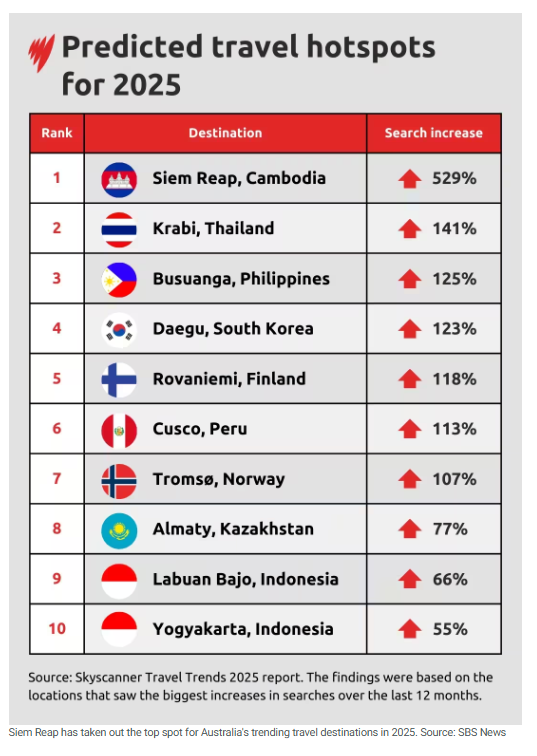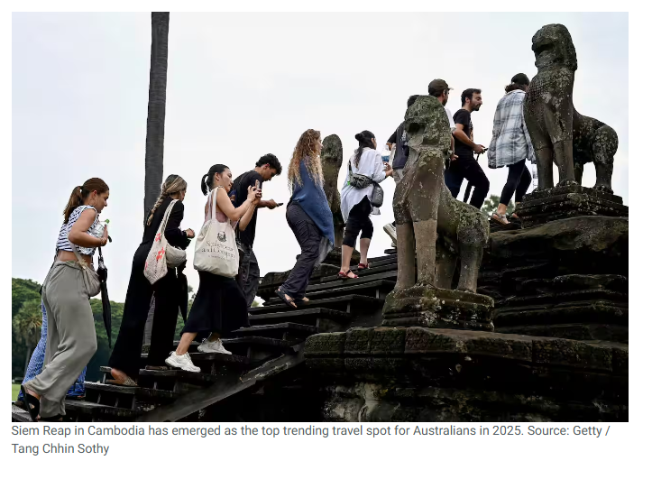 据悉,旅游网站Skyscanner的《2025年旅游趋势》报告显示,明年澳大利亚人最想去的旅游目的地是柬埔寨的Siem Reap,那里有著名的吴哥窟。