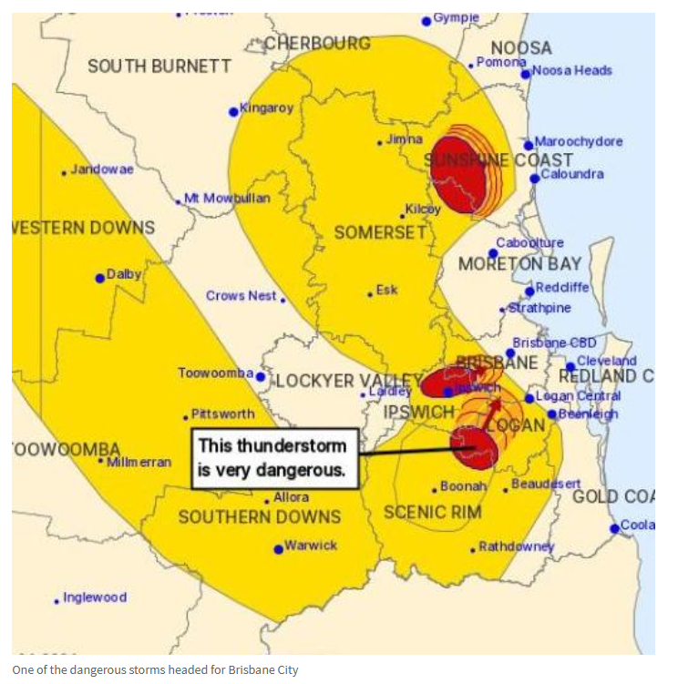 下午5点30分左右,Redbank附近的Spring Mountain在短短30分钟内就下了58毫米的雨,而Blackwater Airport在下午5点20分录得高达113公里/小时的阵风。