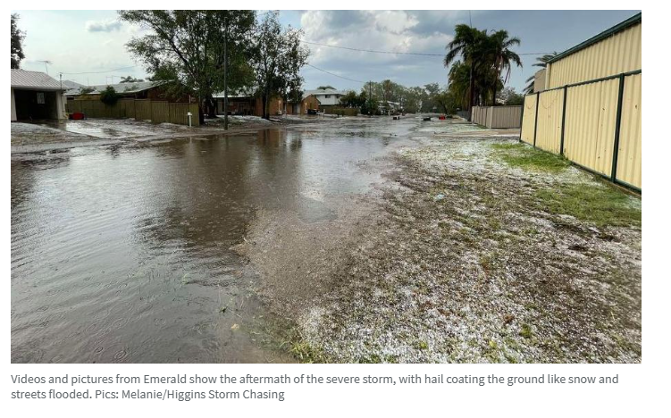 Emerald的视频和图片显示了风暴造成的后果,冰雹像雪一样覆盖着地面,街道被洪水淹没。