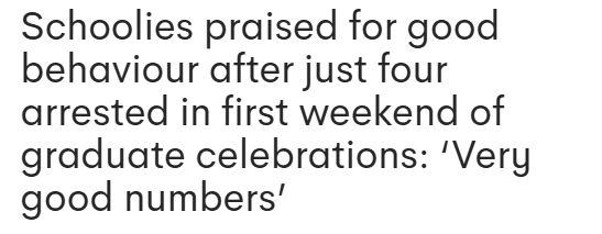 据悉,黄金海岸毕业生狂欢的第一个周末,仅有四名参加聚会的青少年被捕。