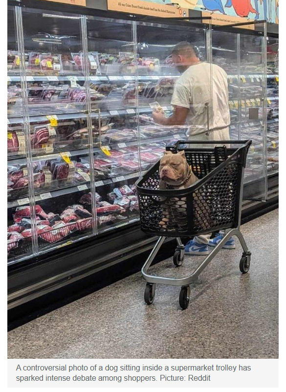 据悉,一张有争议的照片引起了购物者的激烈讨论,照片上,一只狗坐在超市手推车中。