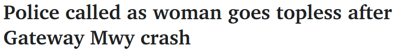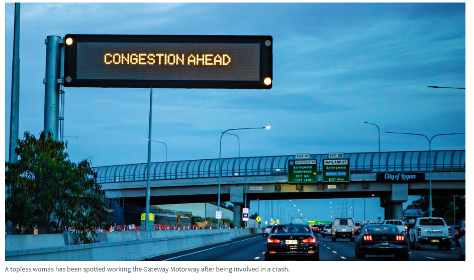 据报道,今晨,一名女子在布里斯班附近的一条主要高速公路上撞车后上身赤裸四处走动。