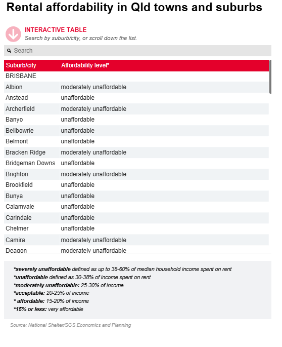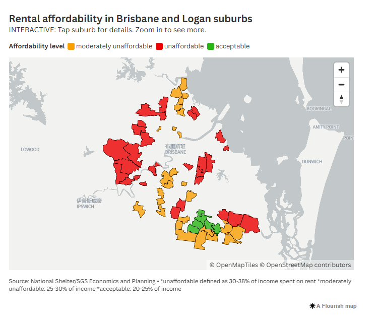 Bardon、Redland City的Wakerley和Gumdale被评为严重负担不起,而Noosa地区则极度负担不起(租金占收入的60%至75%)。