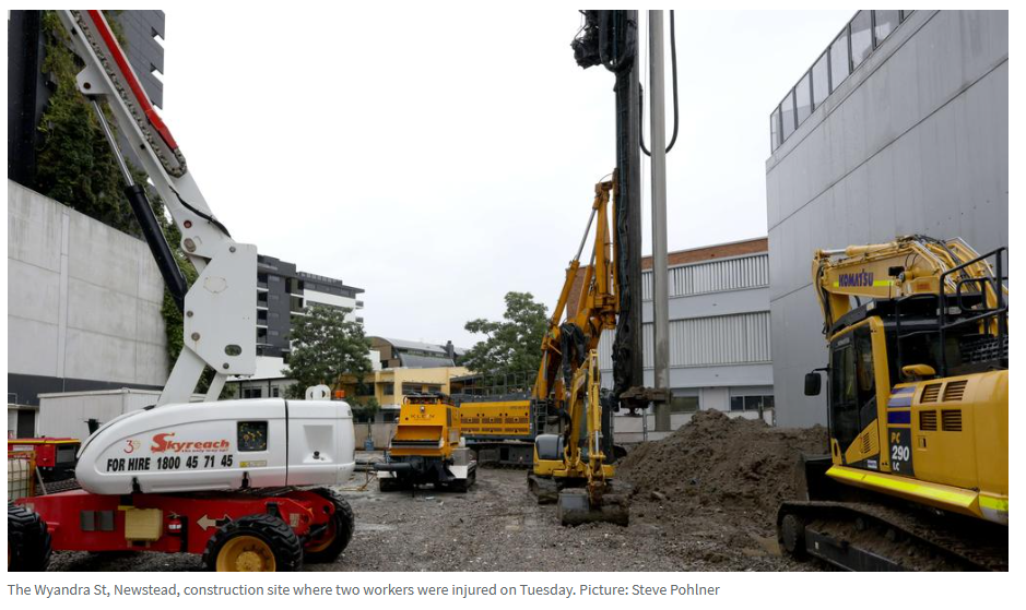 周二中午12点10分,两名男子被一块金属管道击中,据信该管道是从机器上掉下来的,随后紧急救援人员被派往位于Wyandra St, Newstead的Le Bain建筑工地。