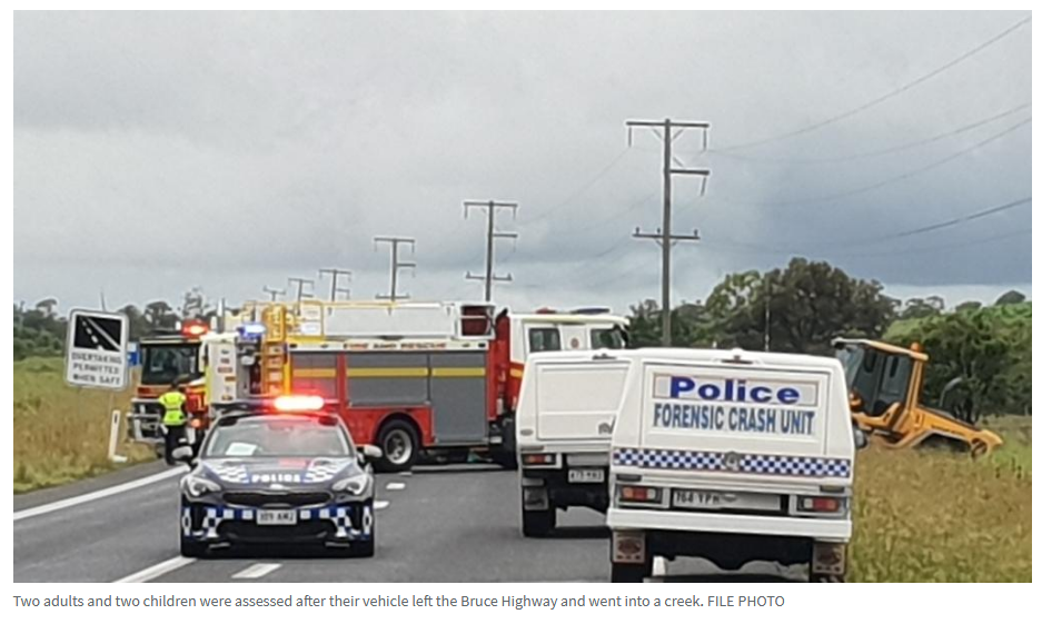 据悉,周一凌晨6点前,一辆汽车驶离Bruce Highway,坠入Rockhampton以南的一条小溪,两名成人和两名儿童正在接受伤情评估。