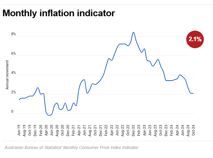 澳大利亚统计局的最新数据表明,截至2024年10月的12个月中,月度消费者价格指数(CPI)降至三年来的最低点,为2.1%,与9月份持平。