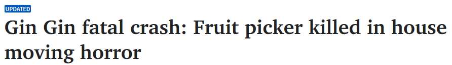 事故发生在Gin Gin南部,一名水果采摘工试图绕过一辆运载房屋的宽体运输车,结果撞上了这辆运输车,随后死亡。