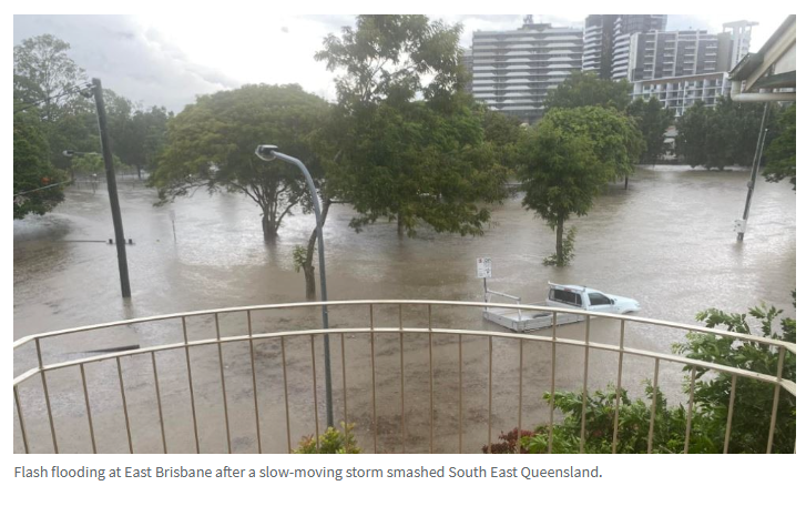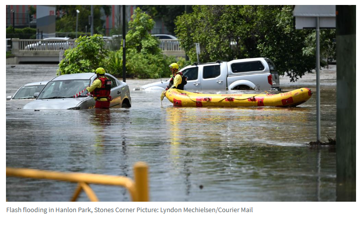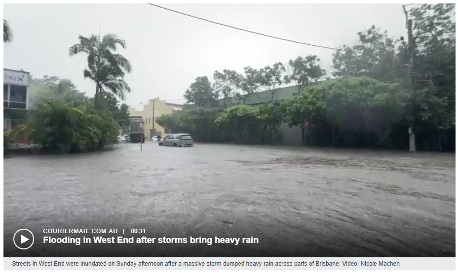 布里斯班CBD在30多分钟内降雨量达到55毫米,而周边郊区降雨量接近100毫米,导致周日下午多条城市街道发生洪水。