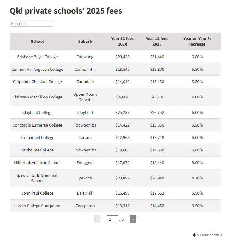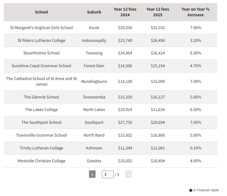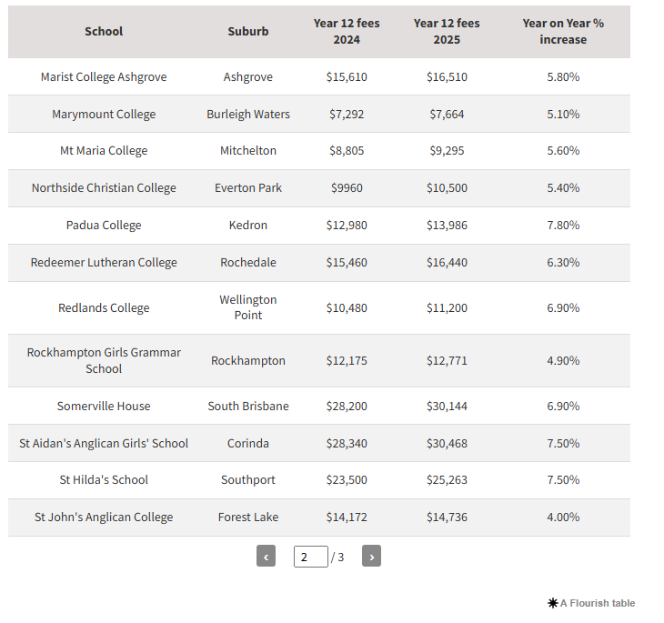 Ashgrove的Marist College 2025年的学费上涨了21%(高三学生为16510澳元),而Rochedale的Redeemer Lutheran College上涨了15%(16440澳元),Jimboomba的Hills International College上涨了16%(9940澳元)。