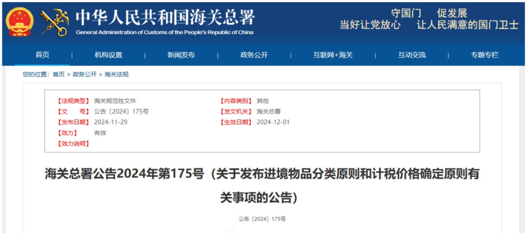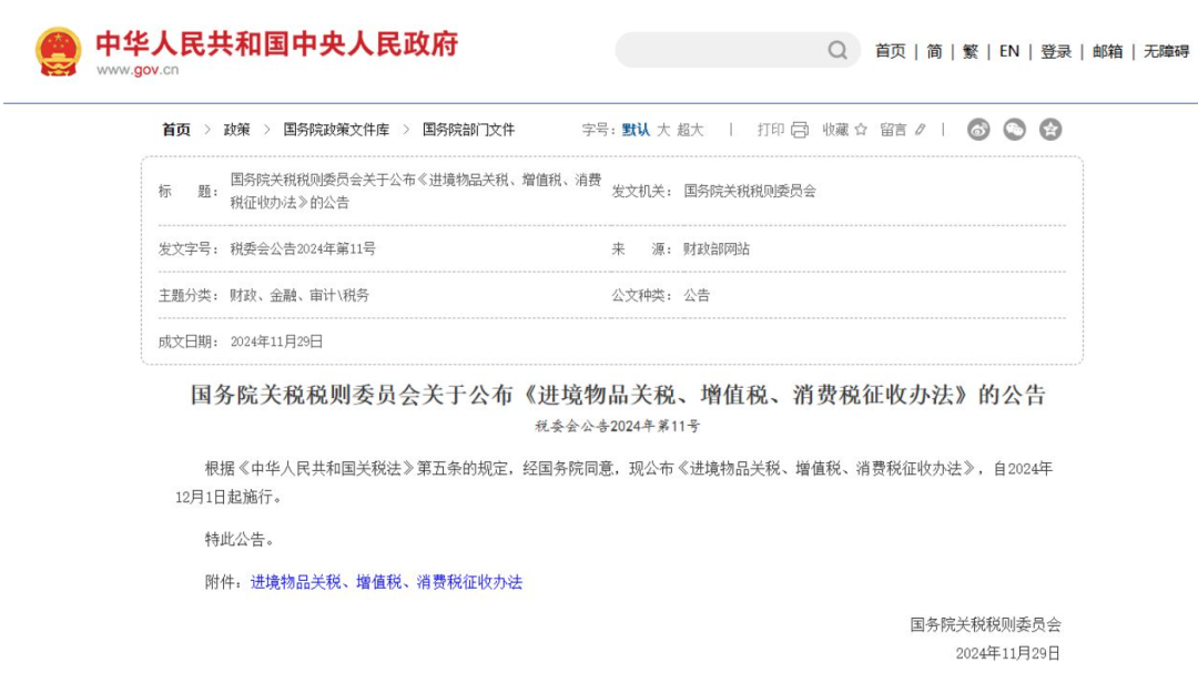 12月1日起,《中华人民共和国关税法》正式实施。为便利进境物品通关,国务院关税税则委员会配套出台《进境物品关税、增值税、消费税征收办法》(以下简称《办法》),海关总署制定进境物品分类原则和计税价格确定原则。