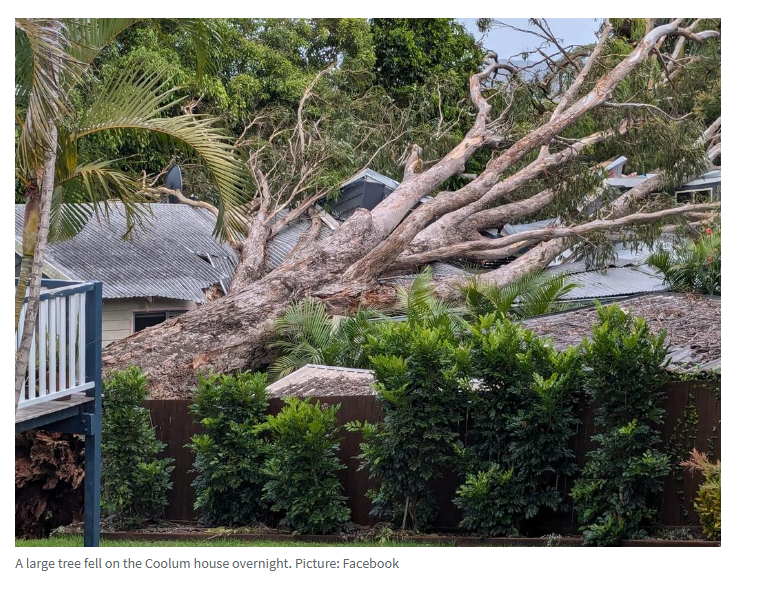 昆州消防局发言人表示,昨晚9点半左右,这棵大树倒在Warrack St, Coolum拐角附近的Centenary Heights Rd上的一栋房屋上,造成严重破坏。