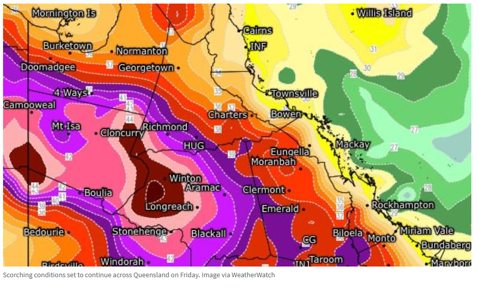 气象局称,Julia Creek正遭受40多度的高温。今天早上11点14分,Julia Creek的气温达到41.3℃。