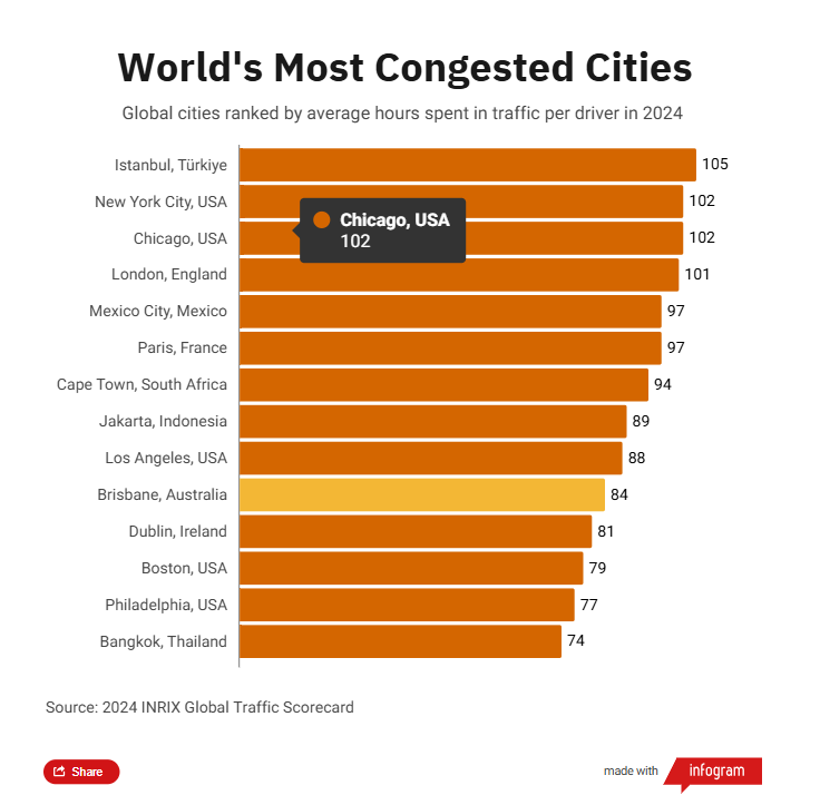 根据交通研究组织INRIX的2024年全球交通记分卡,布里斯班现在因交通拥堵浪费的时间最多,位居全球第十。