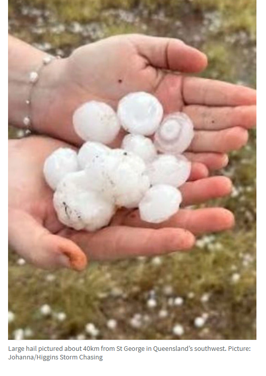 社交媒体上的照片显示,昆州西南部St George附近出现了大面积的冰雹,气象局称该地区观测到的冰雹直径为3厘米,而Roma地区在4点30分左右观测到的冰雹直径为2厘米。