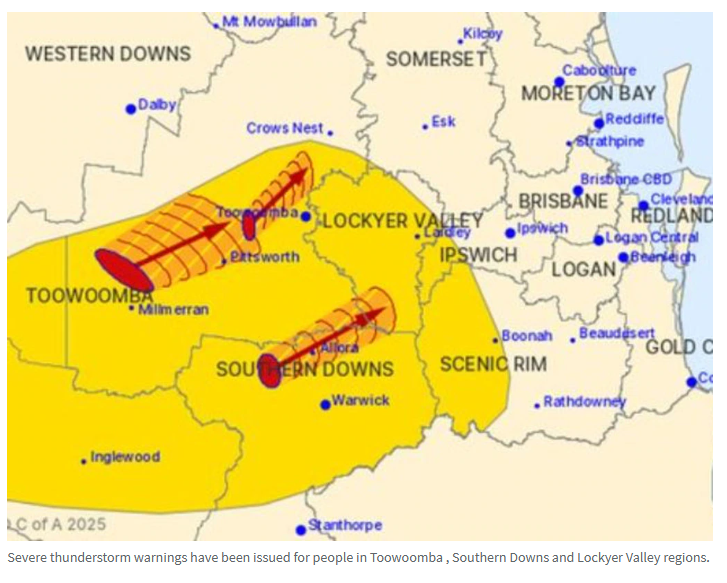 气象局于早上6点左右向Toowoomba、Lockyer Valley和Southern Downs地区的居民发布了预警,提醒他们防范破坏性大风、大冰雹和强降雨。