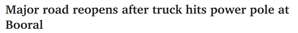 事故发生在Booral Rd与Janine St的交叉路口附近,一辆卡车于上午10点20分左右撞上了电线杆。