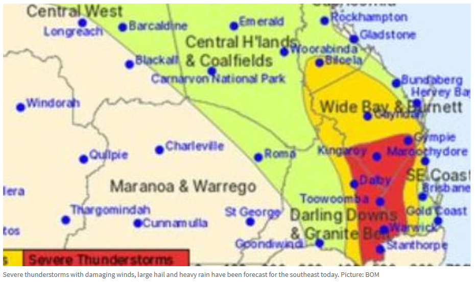 气象局表示,强风暴可能会袭击Wide Bay、Burnett、Granite Belt和东南部内陆地区。
