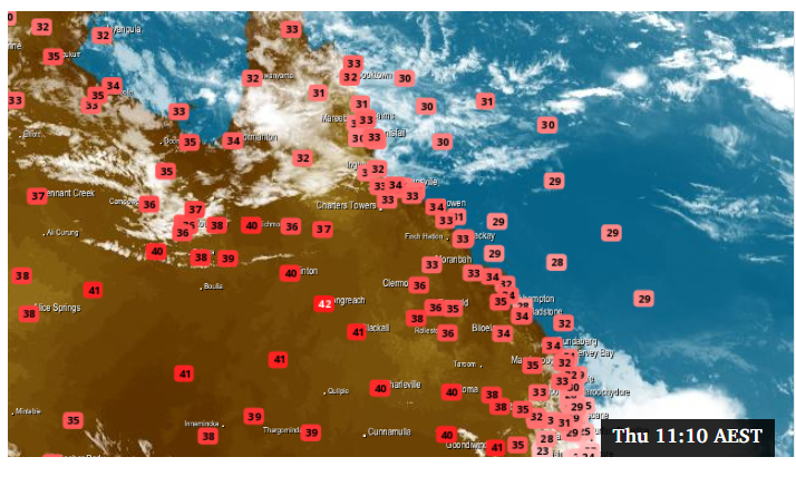 气象学家Angus Hines表示,周三最高气温记录为Birdville的46.3℃。布里斯班的气温为36.4℃,黄金海岸为36.7℃,阳光海岸为35.9℃,沿海地区的气温约为30℃,非常闷热和潮湿。
