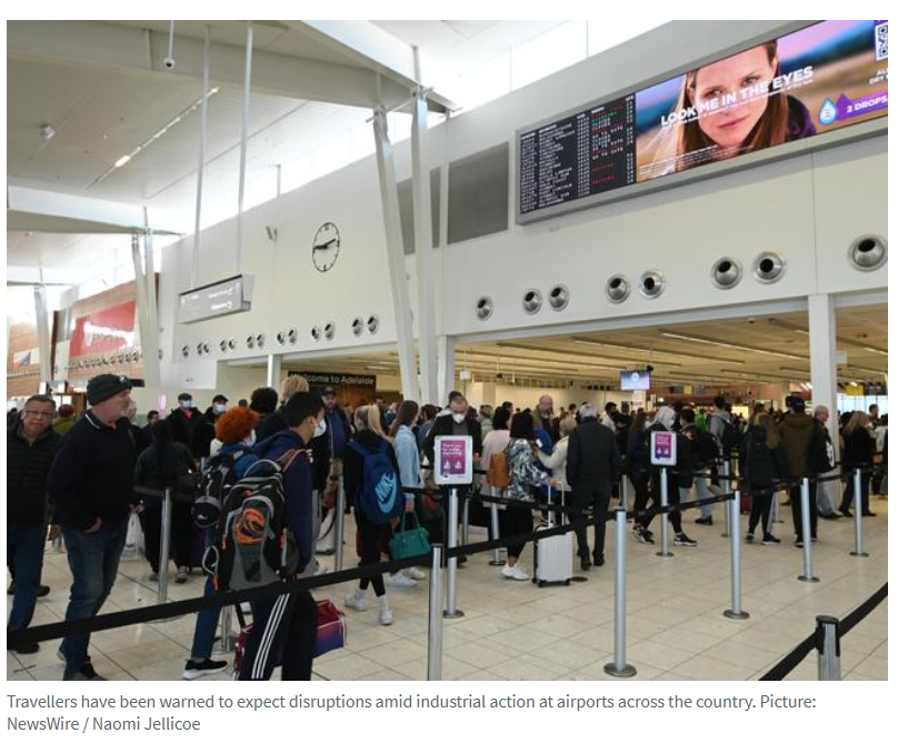 据悉,由于1000多名机场员工罢工,要求改善工作条件,澳大利亚旅客被警告要准备应对全国机场的航班延误和混乱。