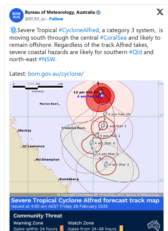 标题: 热带气旋Alfred夜间短暂增强至四级风暴,但不会登陆昆州!
