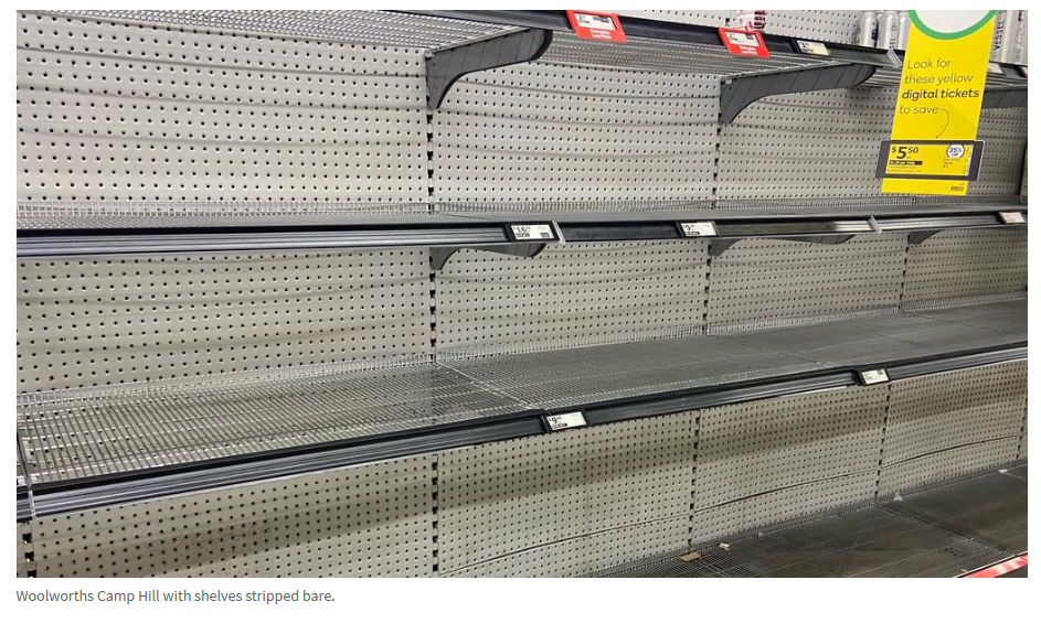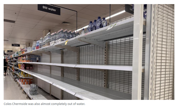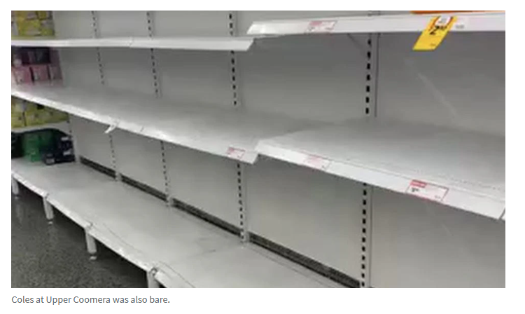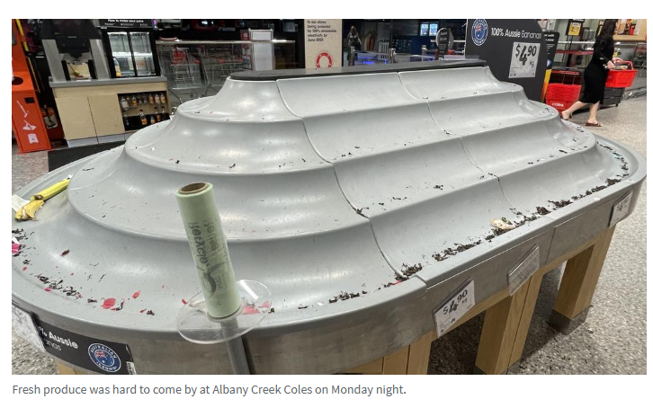 Coles Albany Creek的货架上也已经空空如也,瓶装水、面包、辣椒、黄瓜、肉、鸡蛋、土豆、软饮料和卫生纸都供不应求。