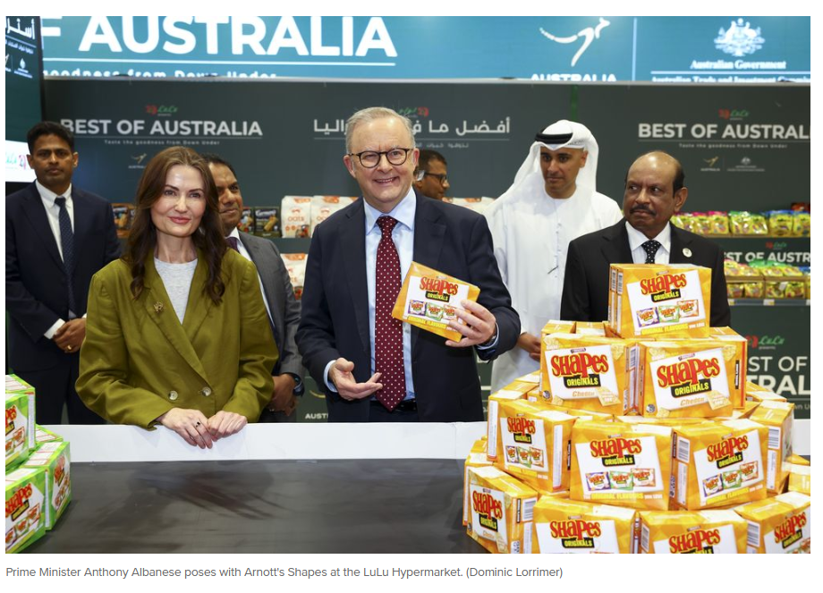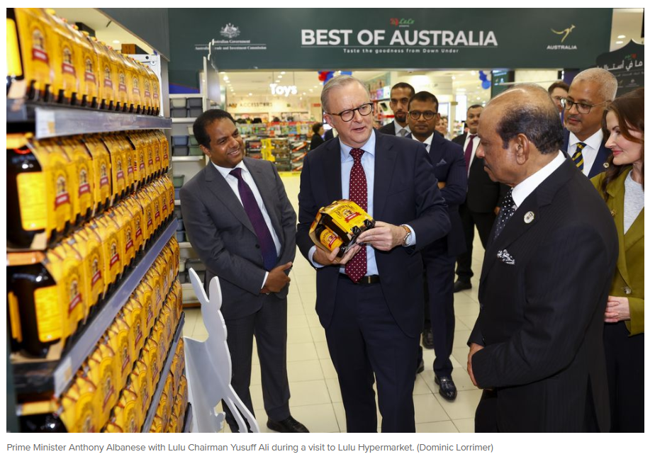 在总理参观LuLu门店期间,该零售集团铺设红毯隆重接待,店内特别陈列澳大利亚商品与国旗。Ali表示:"非常荣幸迎接总理莅临。感谢阁下亲临视察我们进口的澳大利亚优质商品,这些高品质产品正是澳方出口与我方进口的典范。"