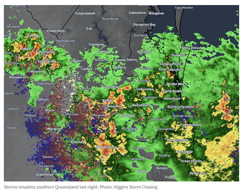 风暴最初在Western Downs地区生成,席卷了Tara、Dalby和Miles等城镇,随后于夜间向东北方向推进,并在午夜前袭击了Moreton Bay及阳光海岸南部地区。